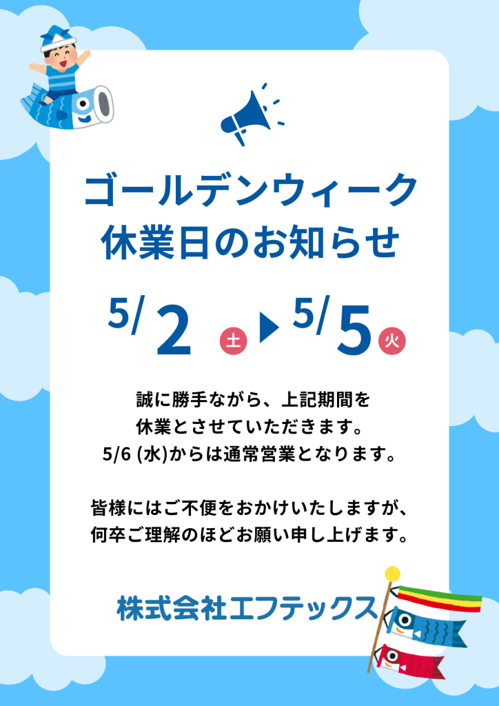2026.04.22 お知らせ ゴールデンウィーク休業のご案内 平素は格別のご愛顧を賜り、厚く御礼申し上げます。下記の期間をGWの休業とさせていただきます。 休業期間2026年5月2日(土) ~ 2026年5月5日(火) 皆様にはご不便をお掛けいたしますが、何卒ご理解のほどお願い申し上げます。 株式会社エフテックス